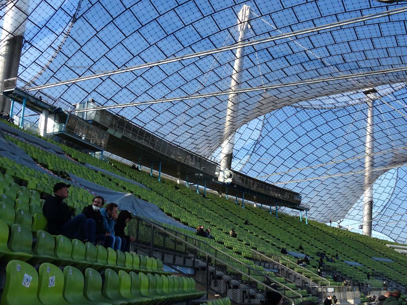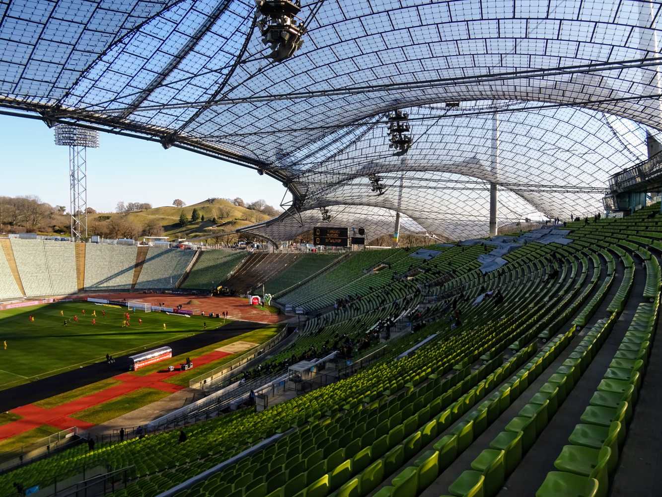 Aunque se construyó entre 1968 y 1972, el Olympiastadion destacó desde el principio por sus soluciones técnicas avanzadas. Su elemento clave es el techo de membrana con paneles acrílicos transparentes sostenidos por cables de acero. La estructura no solo proporcionó cobertura parcial a las gradas, sino que las protegió del viento gracias a su aerodinámica. El techo dejaba pasar luz natural, reduciendo la necesidad de iluminación artificial y aportando ligereza visual. El estadio contó además con un sistema de iluminación y sonorización muy avanzados para su época, ajustados a ceremonias olímpicas y retransmisiones televisivas.